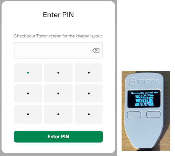 On your trezor will be displayed a nine box grid with the numbers 1 to 9 randomly displayed, you need to look at the trezor to find the position of the number and then click the same box position on the Enter PIN screen in order to gain access to your account.