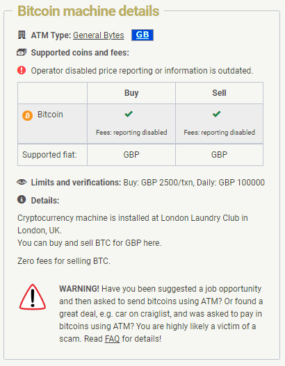 There is a business phone number for the London Laundry Club, call the number and check if the ATM is located on their premises and ask how frequently it is being used, to save a wasted journey.