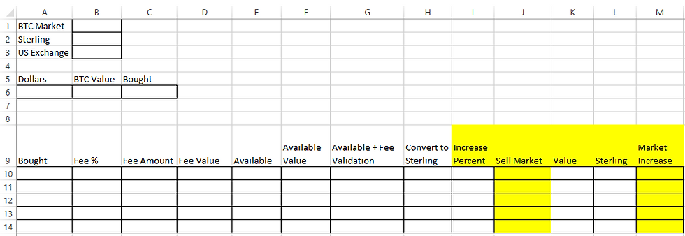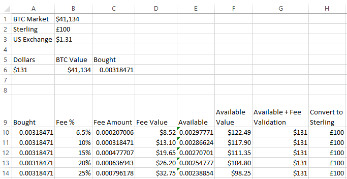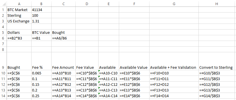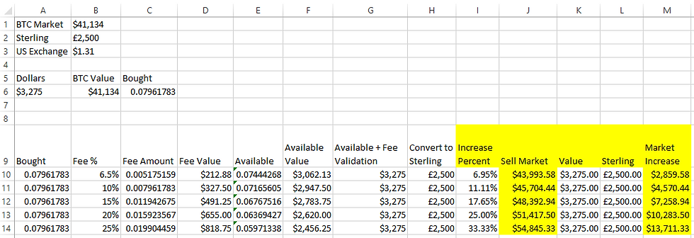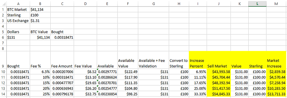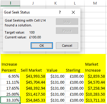To calculate the increase percent we need in the bitcoin price I used the goal seek function in excel, use this after you have completed entering all the additional formulas above. Be sure to set the initial increase percent value to 0.001, the goal seek function will be changing that value to make the sterling price reach £100.