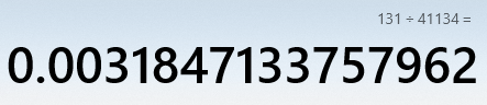 131 / 41134 = 0.00318471